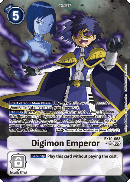 Digimon Emperor EX10-068 SR [Start of Your Main Phase] For every 2 colors your opponent's Digimon and Tamers have, gain 1 memory. [On Play] Delete 1 of your opponent's play cost 5 or lower Digimon. Then, by returning 1 Digimon card from your opponent's trash to the bottom of the deck, from your hand or trash and without paying the cost, you may play 1 level 4 or lower Digimon card with the same color as the card this effect returned. (Rule) Name: Also treated as [Ken Ichijoji]. --- [Security] Play this card without paying the cost.