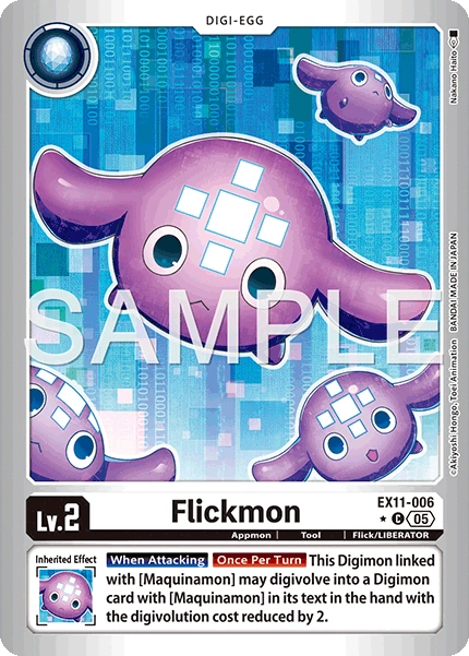 Lv.2 Flickmon EX11-006 C Appmon | Tool | Flick/LIBERATOR --- [When Attacking] [Once Per Turn] This Digimon linked with [Maquinamon] may digivolve into a Digimon card with [Maquinamon] in its text in the hand with the digivolution cost reduced by 2.