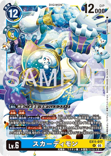 Lv.6 スカーディモン EX11-017 R 究極体 | ワクチン種 | 氷雪型/リベレイター ≪氷装≫≪防壁≫ 【登場時】【進化時】【アタック時】[ターンに1回]自分の手札から、「輝月涼音」か特徴に「氷雪型」を持つLv.4以下のデジモンカード1枚をコストを支払わずに登場できる。 【お互いのターン】[ターンに1回]他のデジモンが登場/進化したとき、相手のデジモンの進化元を選んで3枚破棄する。その後、相手のターン終了まで、進化元を持たない相手のデジモン1体はレストできない。 ---