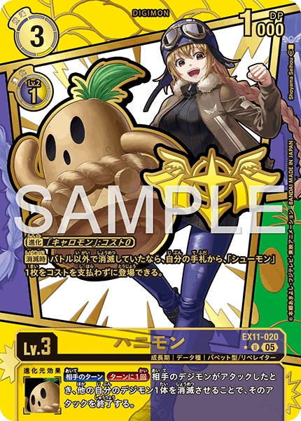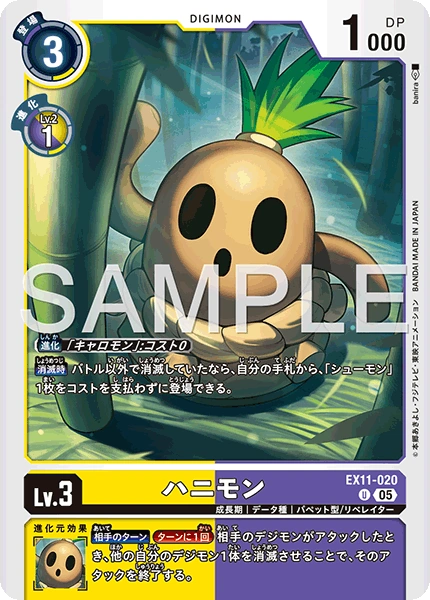Lv.3 ハニモン EX11-020 U 成長期 | データ種 | パペット型/リベレイター 【消滅時】バトル以外で消滅していたなら、自分の手札から、「シューモン」1枚をコストを支払わずに登場できる。 --- 【相手のターン】[ターンに1回]相手のデジモンがアタックしたとき、他の自分のデジモン1体を消滅させることで、そのアタックを終了する。