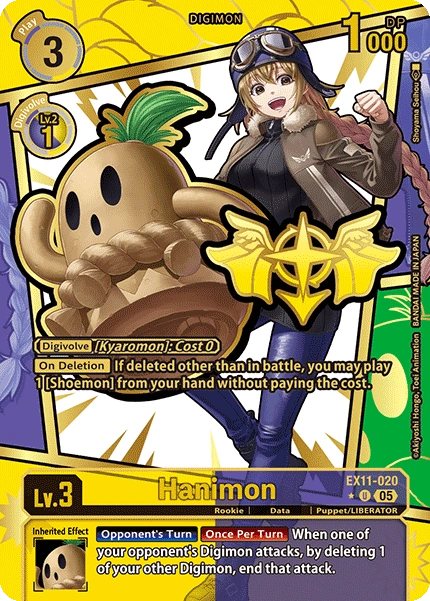 Lv.3 Hanimon EX11-020 U Rookie | Data | Puppet/LIBERATOR [On Deletion] If deleted other than in battle, you may play 1 [Shoemon] from your hand without paying the cost. --- [Opponent's Turn] [Once Per Turn] When one of your opponent's Digimon attacks, by deleting 1 of your other Digimon, end that attack.
