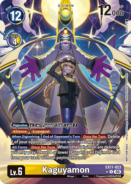 Lv.6 Kaguyamon EX11-023 R mega | Data | Puppet/LIBERATOR [Digivolve] Lv.5 w/[Puppet] trait: Cost 3 <Alliance> <Scapegoat> [When Digivolving] [End of Opponent's Turn] [Once Per Turn] Delete 1 of your opponent's Digimon with the lowest level. [All Turns] [Once Per Turn] When other Digimon are deleted, you may play 1 level 4 or lower [Puppet] trait Digimon card from your trash without paying the cost.