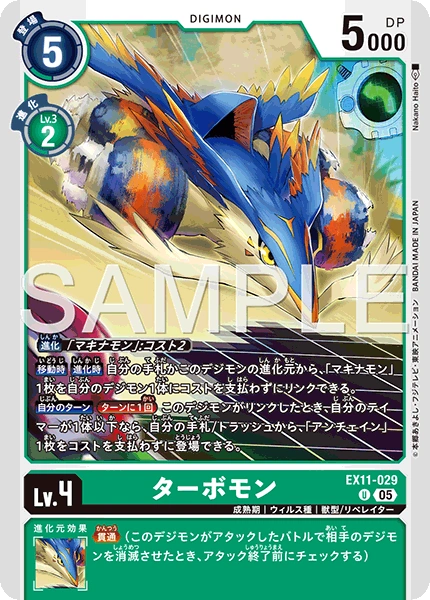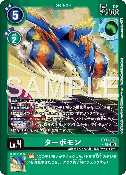 Lv.4 ターボモン EX11-029 U 成熟期 | ウィルス種 | 獣型/リベレイター 【移動時】【進化時】自分の手札かこのデジモンの進化元から、「マキナモン」1枚を自分のデジモン1体にコストを支払わずにリンクできる。 【自分のターン】[ターンに1回]このデジモンがリンクしたとき、自分のテイマーが1体以下なら、自分の手札/トラッシュから、「アンチェイン」1枚をコストを支払わずに登場できる。 --- ≪貫通≫(このデジモンがアタックしたバトルで相手のデジモンを消滅させたとき、アタック終了前にチェックする)