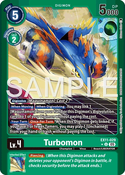 Lv.4 Turbomon EX11-029 U Champion | Virus | Beast/LIBERATOR [Digivolve] [Maquinamon]: Cost 2 [When Moving] [When Digivolving] You may link 1 [Maquinamon] from your hand or this Digimon's digivolution cards to 1 of your Digimon without paying the cost. [Your Turn] [Once Per Turn] When this Digimon gets linked, if you have 1 or fewer Tamers, you may play 1 [Unchained] from your hand or trash without paying the cost. --- <Piercing> (When this Digimon attacks and deletes your opponent's Digimon in battle, it checks security before the attack ends.)