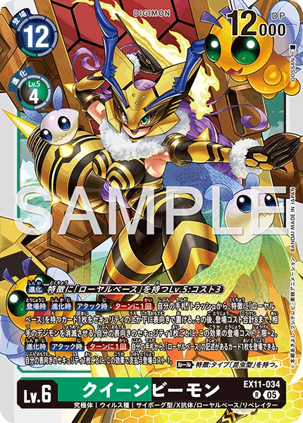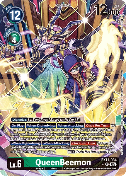 Lv.6 QueenBeemon EX11-034 R mega | Virus | Cyborg/X Antibody/Royal Base/LIBERATOR [Digivolve] Lv.5 w/[Royal Base] trait: Cost 3 [On Play] [When Digivolving] [When Attacking] [Once Per Turn] You may place 1 [Royal Base] trait card from your hand or trash face up as the top or bottom security card. Then, delete up to 8 play cost's total worth of your opponent's Digimon. For each of your face-up security cards, add 2 to this effect's play cost maximum. [When Digivolving] [When Attacking] [Once Per Turn] You may play 1 card with [Royal Base] in its text from your hand. For each of your face-up security cards, reduce this effect's paid play cost by 1. (Rule) Trait: Has [Insectoid] Type.