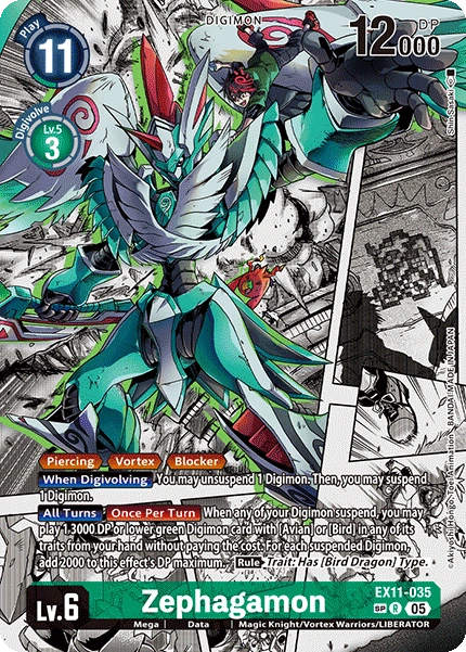 Lv.6 Zephagamon EX11-035 R Mega | Data | Magic Knight/Vortex Warriors/LIBERATOR <Piercing> <Vortex> <Blocker> [When Digivolving] You may unsuspend 1 Digimon. Then, you may suspend 1 Digimon. [All Turns] [Once Per Turn] When any of your Digimon suspend, you may play 1 3000 DP or lower green Digimon card with [Avian] or [Bird] in any of its traits from your hand without paying the cost. For each suspended Digimon, add 2000 to this effect's DP maximum. (Rule) Trait: Has [Bird Dragon] Type. ---