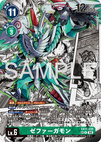 Lv.6 ゼファーガモン EX11-035 R 究極体 | データ種 | 魔法騎士型/ヴォルテクスウォリアー/リベレイター ≪貫通≫≪ヴォルテクス≫≪ブロッカー≫ 【進化時】デジモン1体をアクティブにできる。その後、デジモン1体をレストできる。 【お互いのターン】[ターンに1回]自分のデジモンがレストしたとき、自分の手札から、特徴に「鳥」を含む緑のDP3000以下のデジモンカード1枚をコストを支払わずに登場できる。レスト状態のデジモン1体ごとに、この効果のDP上限+2000。 〈ルール〉特徴:タイプ「鳥竜型」を持つ。 ---
