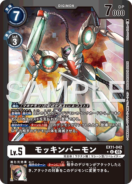 Lv.5 モッキンバーモン EX11-042 U 完全体 | ワクチン種 | マシーン型/リベレイター 【登場時】【進化時】自分の手札かこのデジモンのリンクカードから、「マキナモン」1枚をコストを支払わずに登場できる。 【自分のターン】[ターンに1回]このデジモンがリンクしたとき、登場コスト5以下の相手のデジモン1体を消滅させる。 --- 【相手のターン】[ターンに1回]相手のデジモンがアタックしたとき、アタックの対象をこのデジモンに変更できる。