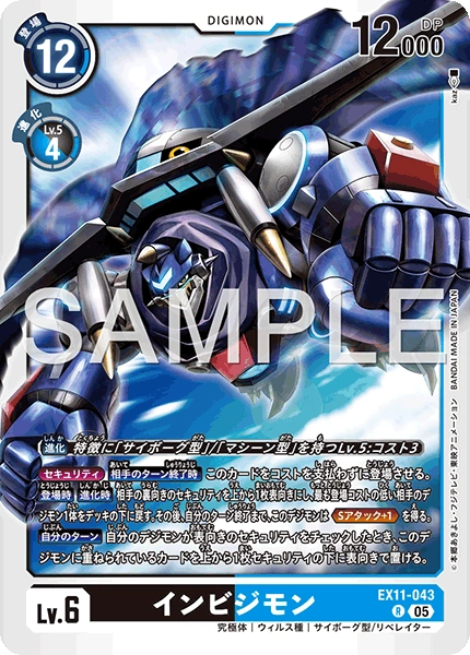 -Lv.6 Invisimon EX11-043 R mega | Virus | Cyborg/LIBERATOR [Digivolve] Lv.5 w/[Cyborg]/[Machine] trait: Cost 3 (Security) [End of Opponent's Turn] Play this card without paying the cost. [On Play] [When Digivolving] Flip your opponent's top face-down security card face up and return 1 of their lowest play cost Digimon to the bottom of the deck. Then, this Digimon gains <Security A. +1> until your turn ends. [Your Turn] When any of your Digimon check face-up security cards, you may place this Digimon's top stacked card face up as the bottom security card.