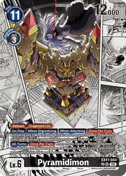 Lv.6 Pyramidimon EX11-044 SR mega | Virus | Mineral/LIBERATOR <Reboot> <Fragment ≪3≫> [On Play] [When Digivolving] [When Attacking] [Once Per Turn] By trashing any 3 [Mineral] or [Rock] trait cards from your Digimon's digivolution cards, delete 1 of your opponent's highest play cost Digimon or Tamers. [All Turns] [Once Per Turn] When effects trash any of this Digimon's digivolution cards, you may place 3 [Mineral] or [Rock] trait cards from your trash as this Digimon's bottom digivolution cards.