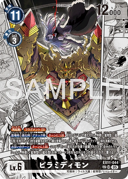 Lv.6 ピラミディモン EX11-044 SR 究極体 | ウィルス種 | 鉱物型/リベレイター ≪再起動≫≪フラグメント《3》≫ 【登場時】【進化時】【アタック時】[ターンに1回]自分のデジモンの進化元から、特徴に「鉱物型」/「鉱石型」を持つカード3枚を破棄することで、最も登場コストの高い相手のデジモン/テイマー1体を消滅させる。 【お互いのターン】[ターンに1回]このデジモンの進化元が効果で破棄されたとき、自分のトラッシュから、特徴に「鉱物型」/「鉱石型」を持つカード3枚をこのデジモンの進化元の下に置ける。 ---