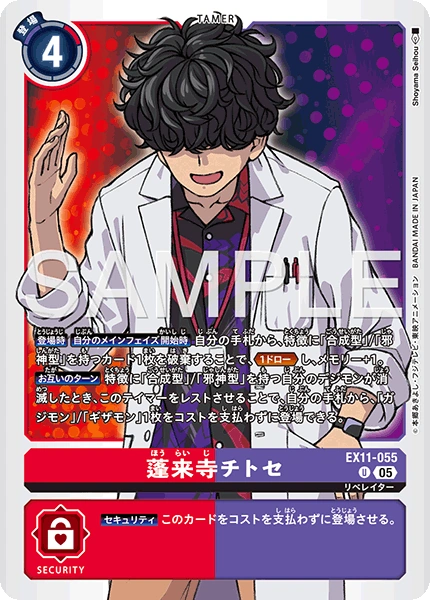 蓬来寺 チトセ EX11-055 U リベレイター 【登場時】【自分のメインフェイズ開始時】自分の手札から、特徴に「合成型」/「邪神型」を持つカード1枚を破棄することで、≪1ドロー≫し、メモリー+1。 【お互いのターン】特徴に「合成型」/「邪神型」を持つ自分のデジモンが消滅したとき、このテイマーをレストさせることで、自分の手札から、「ガジモン」/「ギザモン」1枚をコストを支払わずに登場できる。 --- 【セキュリティ】このカードをコストを支払わずに登場させる。