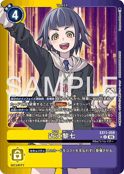 近江 黎七 EX11-059 U NSo/リベレイター 【自分のメインフェイズ開始時】【登場時】自分の手札から、特徴に「NSo」を持つカード1枚を破棄することで、≪1ドロー≫し、メモリー+1。 【お互いのターン】特徴に「NSo」を持つ自分のデジモンが消滅したとき、このテイマーをレストさせることで、特徴に「NSo」を持つ自分のデジモン1体とトラッシュの特徴に「NSo」を持つデジモンカード1枚で手札の特徴に「NSo」を持つデジモンカードにジョグレス進化できる。 --- 【セキュリティ】このカードをコストを支払わずに登場させる。