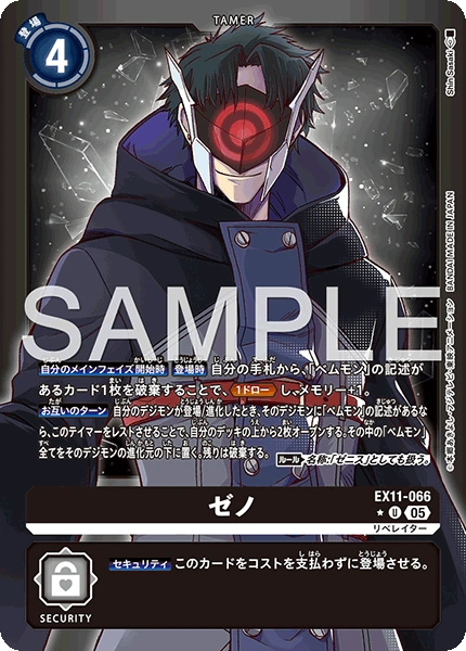 ゼノ EX11-066 U リベレイター 【自分のメインフェイズ開始時】【登場時】自分の手札から、「ベムモン」の記述があるカード1枚を破棄することで、≪1ドロー≫し、メモリー+1。 【お互いのターン】自分のデジモンが登場/進化したとき、そのデジモンに「ベムモン」の記述があるなら、このテイマーをレストさせることで、自分のデッキの上から2枚オープンする。その中の「ベムモン」全てをそのデジモンの進化元の下に置く。残りは破棄する。 〈ルール〉名称:「ゼニス」としても扱う。 --- 【セキュリティ】このカードをコストを支払わずに登場させる。