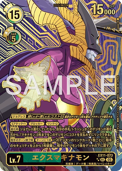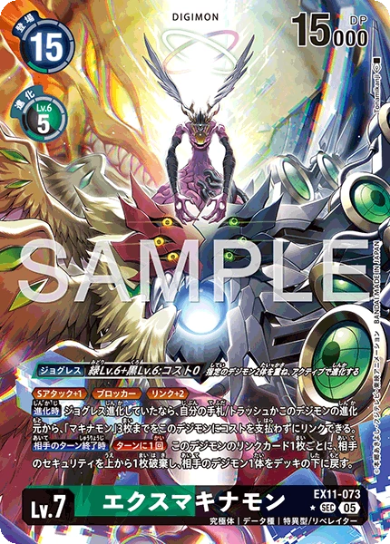 Lv.7 エクスマキナモン EX11-073 SEC 究極体 | データ種 | 特異型/リベレイター ≪Sアタック+1≫≪ブロッカー≫≪リンク+2≫ 【進化時】ジョグレス進化していたなら、自分の手札/トラッシュかこのデジモンの進化元から、「マキナモン」3枚までをこのデジモンにコストを支払わずにリンクできる。 【相手のターン終了時】[ターンに1回]このデジモンのリンクカード1枚ごとに、相手のセキュリティを上から1枚破棄し、相手のデジモン1体をデッキの下に戻す。 ---