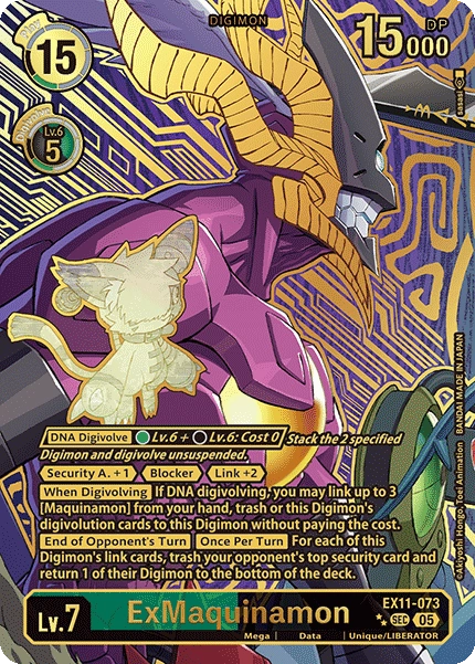 Lv.7 ExMaquinamon EX11-073 SEC mega | Data | Unique/LIBERATOR [DNA Digivolve] Green Lv.6 + Black Lv.6: Cost 0 <Security A. +1> <Blocker> <Link +2> [When Digivolving] If DNA digivolving, you may link up to 3 [Maquinamon] from your hand, trash or this Digimon's digivolution cards to this Digimon without paying the cost. [End of Opponent's Turn] [Once Per Turn] For each of this Digimon's link cards, trash your opponent's top security card and return 1 of their Digimon to the bottom of the deck.
