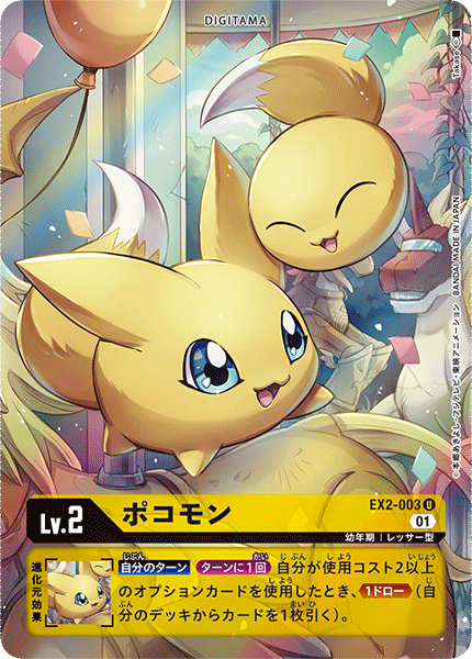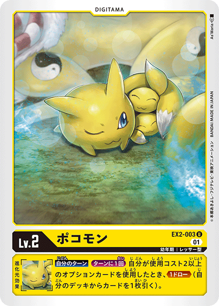 Lv.2 ポコモン EX2-003 U 幼年期 | レッサー型 --- 【自分のターン】[ターンに1回]自分が使用コスト2以上のオプションカードを使用したとき、≪1ドロー≫(自分のデッキからカードを1枚引く)。