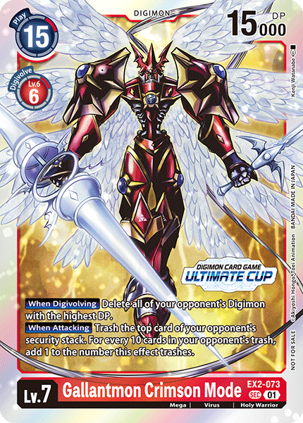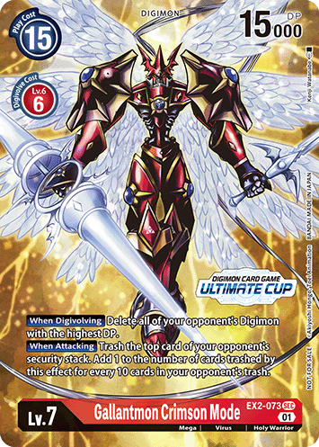 Lv.7 Gallantmon Crimson Mode EX2-073 SEC Mega | Virus | Holy Warrior [When Digivolving] Delete all of your opponent's Digimon with the highest DP.[When Attacking] Trash the top card of your opponent's security stack. Add 1 to the number of cards trashed by this effect for every 10 cards in your opponent's trash. --- -