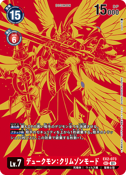 Lv.7 デュークモン:クリムゾンモード EX2-073 SEC 究極体 | ウィルス種 | 聖騎士型 【進化時】最もDPが高い相手のデジモン全てを消滅させる。 【アタック時】相手のセキュリティを上から1枚破棄する。相手のトラッシュ10枚ごとに、この効果で破棄する枚数を+1する。 ---