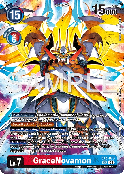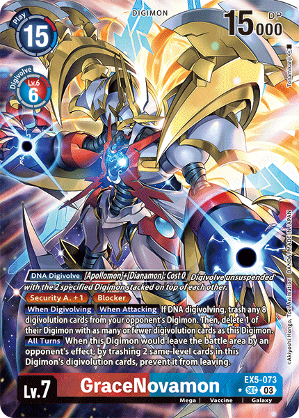 Lv.7 GraceNovamon EX5-073 SEC mega | Vaccine | Galaxy [DNA Digivolve] [Apollomon]+[Dianamon]: Cost 0 <Security A. +1> <Blocker> [When Digivolving] [When Attacking] If DNA digivolving, trash any 8 digivolution cards from your opponent's Digimon. Then, delete 1 of their Digimon with as many or fewer digivolution cards as this Digimon. [All Turns] When this Digimon would leave the battle area by an opponent's effect, by trashing 2 same-level cards in this Digimon's digivolution cards, prevent it from leaving.