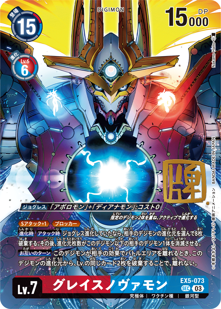 Lv.7 グレイスノヴァモン EX5-073 SEC 究極体 | ワクチン種 | 銀河型 ≪Sアタック+1≫≪ブロッカー≫ 【進化時】【アタック時】ジョグレス進化していたなら、相手のデジモンの進化元を選んで8枚破棄する。その後、進化元の枚数がこのデジモン以下の相手のデジモン1体を消滅させる。 【お互いのターン】このデジモンが相手の効果でバトルエリアを離れるとき、このデジモンの進化元から、Lv.の同じカード2枚を破棄することで、離れない。 ---