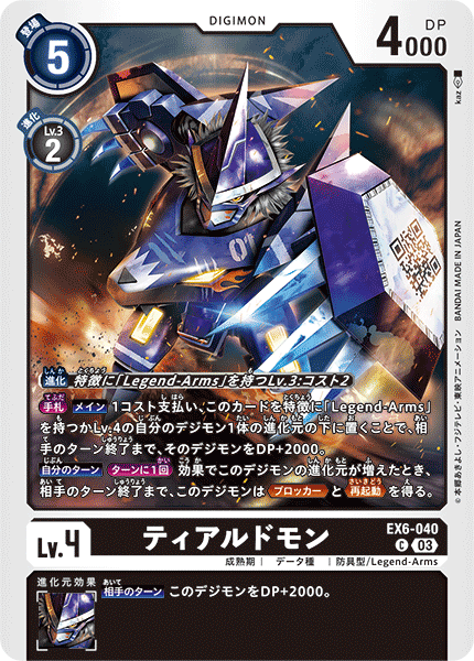 Lv.4 ティアルドモン EX6-040 C 成熟期 | データ種 | 防具型/Legend-Arms [手札]【メイン】1コスト支払い、このカードを特徴に「Legend-Arms」を持つかLv.4の自分のデジモン1体の進化元の下に置くことで、相手のターン終了まで、そのデジモンをDP+2000。 【自分のターン】[ターンに1回]効果でこのデジモンの進化元が増えたとき、相手のターン終了まで、このデジモンは≪ブロッカー≫と≪再起動≫を得る。 --- 【相手のターン】このデジモンをDP+2000。