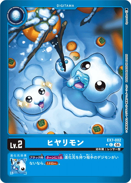 Lv.2 ヒヤリモン EX7-002 C 幼年期 | レッサー型 --- 【アタック時】[ターンに1回]進化元を持つ相手のデジモンがいないなら、≪1ドロー≫。