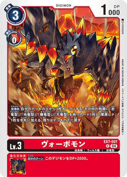 Lv.3 ヴォーボモン EX7-007 R 成長期 | ウィルス種 | 岩竜型 【登場時】自分のデッキの上から3枚オープンする。その中の特徴に「岩竜型」/「地竜型」/「機竜型」/「天竜型」を持つカード1枚と「栗原ヒナ」1枚を手札に加える。残りはデッキの下に戻す。 --- 【自分のターン】このデジモンをDP+2000。
