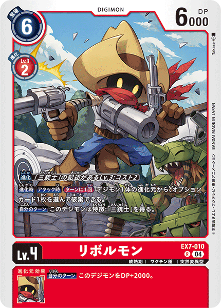 Lv.4 リボルモン EX7-010 R 成熟期 | ワクチン種 | 突然変異型 【進化時】【アタック時】[ターンに1回]デジモン1体の進化元から、オプションカード1枚を選んで破棄できる。 【自分のターン】このデジモンは特徴:「三銃士」を得る。 --- 【自分のターン】このデジモンをDP+2000。