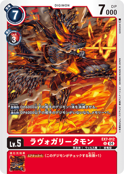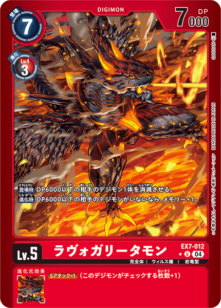 Lv.5 ラヴォガリータモン EX7-012 U 完全体 | ウィルス種 | 岩竜型 【登場時】DP6000以下の相手のデジモン1体を消滅させる。 【進化時】DP6000以下の相手のデジモンがいないなら、メモリー+1。 --- ≪Sアタック+1≫(このデジモンがチェックする枚数+1)