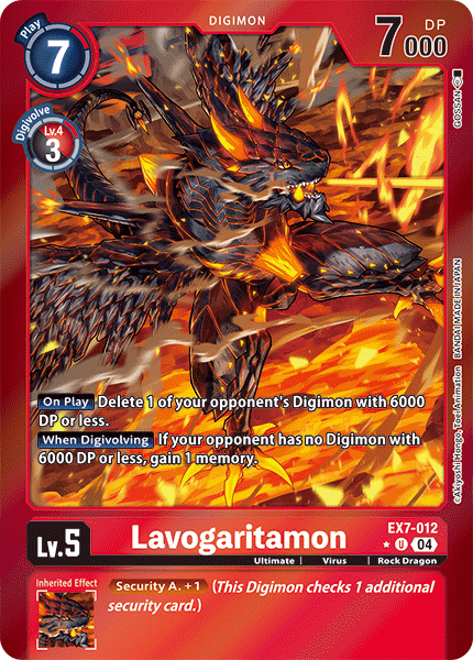Lv.5 Lavogaritamon EX7-012 U Ultimate | Virus | Rock Dragon [On Play] Delete 1 of your opponent's Digimon with 6000 DP or less. [When Digivolving] If your opponent has no Digimon with 6000 DP or less, gain 1 memory. --- <Security A. +1> (This Digimon checks 1 additional security card.)