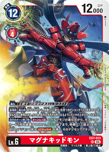 Lv.6 マグナキッドモン EX7-013 SR 究極体 | ウィルス種 | 竜人型/三銃士 【登場時】【進化時】自分の手札から、特徴に「三銃士」を持つオプションカード1枚をコストを支払わずに使用できる。その後、自分の手札が6枚になるようにデッキの上からカードを引く。 【自分のターン終了時】[ターンに1回]このデジモンの進化元から、オプションカード1枚を破棄することで、ターン終了まで、特徴に「三銃士」を持つ自分のデジモン1体は≪Sアタック+1≫を得て、そのデジモンでアタックする。 ---