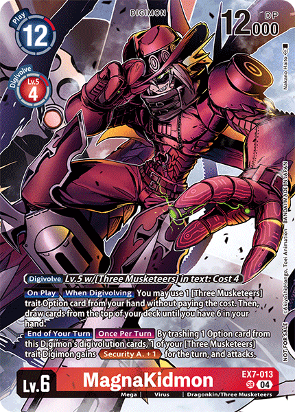 Lv.6 MagnaKidmon EX7-013 SR Mega | Virus | Dragonkin/Three Musketeers [On Play] [When Digivolving] You may use 1 [Three Musketeers] trait Option card from your hand without paying the cost. Then, draw cards from the top of your deck until you have 6 in your hand. [End of Your Turn] [Once Per Turn] By trashing 1 Option card from this Digimon's digivolution cards, 1 of your [Three Musketeers] trait Digimon gains <Security A. +1> for the turn, and attacks. ---