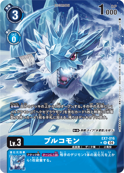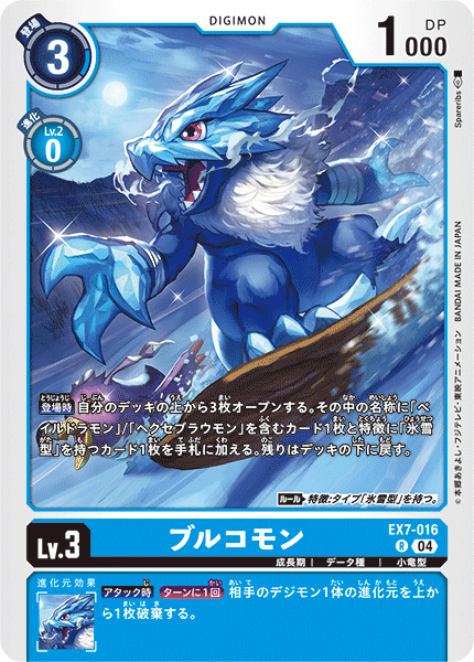 Lv.3 ブルコモン EX7-016 R 成長期 | データ種 | 小竜型 【登場時】自分のデッキの上から3枚オープンする。その中の名称に「ペイルドラモン」/「ヘクセブラウモン」を含むカード1枚と特徴に「氷雪型」を持つカード1枚を手札に加える。残りはデッキの下に戻す。 〈ルール〉特徴:タイプ「氷雪型」を持つ。 --- 【アタック時】[ターンに1回]相手のデジモン1体の進化元を上から1枚破棄する。