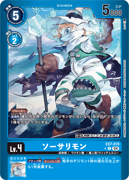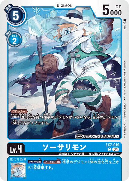 Lv.4 ソーサリモン EX7-019 C 成熟期 | ワクチン種 | 魔人型/ウィッチェルニー ≪ブロッカー≫ 【登場時】進化元を持つ相手のデジモンがいないなら、自分のデジモン1体をアクティブにする。 〈ルール〉特徴:タイプ「氷雪型」を持つ。 --- 【アタック時】[ターンに1回]相手のデジモン1体の進化元を上から1枚破棄する。