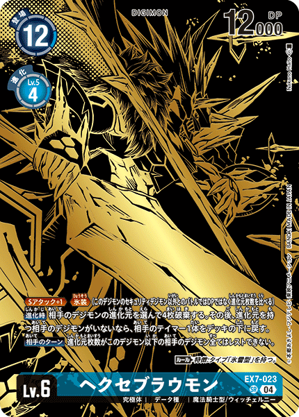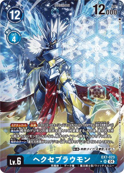 Lv.6 ヘクセブラウモン EX7-023 SR 究極体 | データ種 | 魔法騎士型/ウィッチェルニー ≪Sアタック+1≫≪氷装≫(このデジモンのセキュリティデジモン以外とのバトルではDPではなく進化元枚数を比べる) 【進化時】相手のデジモンの進化元を選んで4枚破棄する。その後、進化元を持つ相手のデジモンがいないなら、相手のテイマー1体をデッキの下に戻す。 【相手のターン】進化元枚数がこのデジモン以下の相手のデジモン全てはレストできない。 〈ルール〉特徴:タイプ「氷雪型」を持つ。 ---