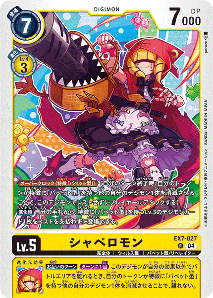 Lv.5 シャペロモン EX7-027 R 完全体 | ウィルス種 | パペット型/リベレイター ≪オーバークロック《特徴「パペット型」》≫(自分のターン終了時、自分のトークンか特徴に「パペット型」を持つ他の自分のデジモン1体を消滅させることで、このデジモンでレストせずにプレイヤーにアタックする) 【進化時】自分の手札から、特徴に「パペット型」を持つLv.3のデジモンカード1枚をコストを支払わずに登場できる。 --- 【お互いのターン】[ターンに1回]このデジモンが自分の効果以外でバトルエリアを離れるとき、自分のトークンか特徴に「パペット型」を持つ他の自分のデジモン1体を消滅させることで、離れない。