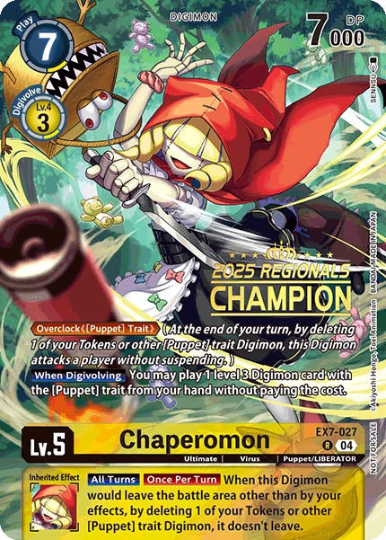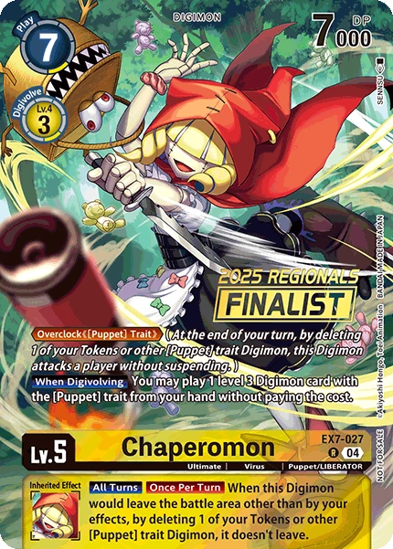 Lv.5 Chaperomon EX7-027 R Ultimate | Virus | Puppet/LIBERATOR <Overclock ([Puppet] Trait)> (At the end of your turn, by deleting 1 of your Tokens or other [Puppet] trait Digimon, this Digimon may attack a player without suspending.) [When Digivolving] You may play 1 level 3 Digimon card with the [Puppet] trait from your hand without paying the cost. --- [All Turns] [Once Per Turn] When this Digimon would leave the battle area other than by your effects, by deleting 1 of your Tokens or other [Puppet] trait Digimon, it doesn't leave.