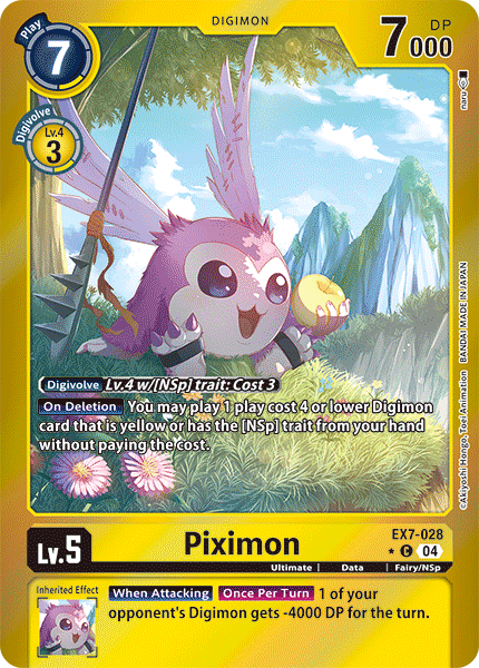 Lv.5 Piximon EX7-028 C Ultimate | Data | Fairy/NSp [Digivolve] Lv.4 w/[NSp] trait: Cost 3 [On Deletion] You may play 1 play cost 4 or lower Digimon card that is yellow or has the [NSp] trait from your hand without paying the cost. --- [When Attacking] [Once Per Turn] 1 of your opponent's Digimon gets -4000 DP for the turn.