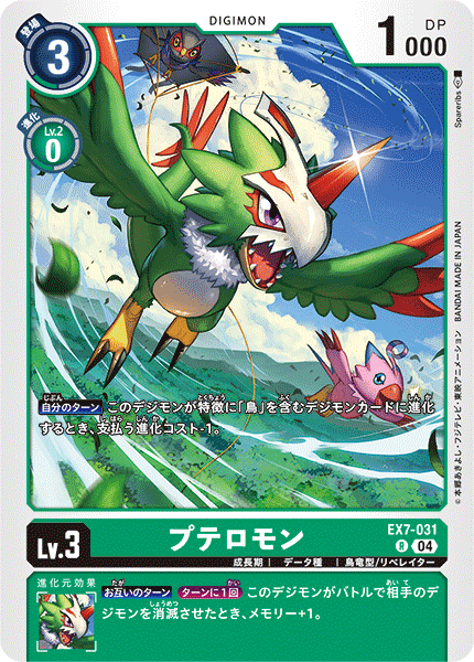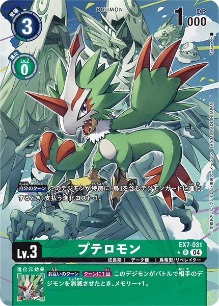 Lv.3 プテロモン EX7-031 R 成長期 | データ種 | 鳥竜型/リベレイター 【自分のターン】このデジモンが特徴に「鳥」を含むデジモンカードに進化するとき、支払う進化コスト-1。 --- 【お互いのターン】[ターンに1回]このデジモンがバトルで相手のデジモンを消滅させたとき、メモリー+1。