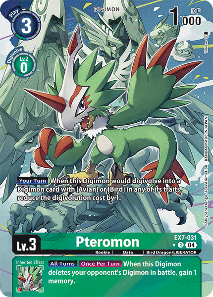 Lv.3 Pteromon EX7-031 R Rookie | Data | Bird Dragon/LIBERATOR [Your Turn] When this Digimon would digivolve into a Digimon card with [Avian] or [Bird] in any of its traits, reduce the digivolution cost by 1. --- [All Turns] [Once Per Turn] When this Digimon deletes your opponent's Digimon in battle, gain 1 memory.
