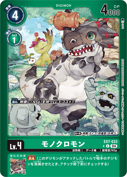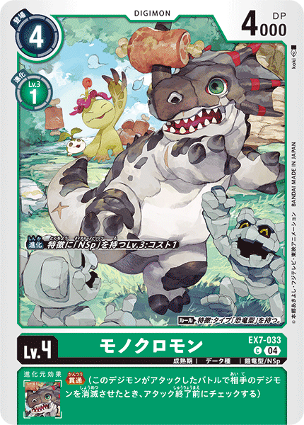 Lv.4 モノクロモン EX7-033 C 成熟期 | データ種 | 鎧竜型/NSp 〈ルール〉特徴:タイプ「恐竜型」を持つ。 --- ≪貫通≫(このデジモンがアタックしたバトルで相手のデジモンを消滅させたとき、アタック終了前にチェックする)