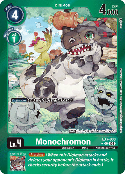 Lv.4 Monochromon EX7-033 C champion | Data | Ankylosaur/NSp [Digivolve] Lv.3 w/[NSp] trait: Cost 1 (Rule) Trait: Has [Dinosaur] Type. --- <Piercing> (When this Digimon attacks and deletes an opponent's Digimon, it performs any security checks it normally would.)