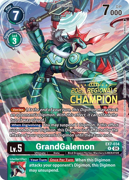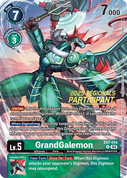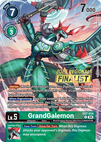 Lv.5 GrandGalemon EX7-034 R Ultimate | Data | Bird Dragon/Vortex Warriors/LIBERATOR <Vortex> (At the end of your turn, this Digimon may attack an opponent's Digimon. With this effect, it can attack the turn it was played.) [When Digivolving] You may suspend 1 Digimon. If this effect suspended your Digimon, this Digimon isn't affected by the effects of your opponent's Digimon until the end of their turn. --- [Your Turn] [Once Per Turn] When this Digimon attacks your opponent's Digimon, this Digimon may unsuspend.