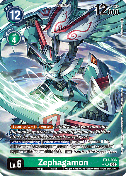 Lv.6 Zephagamon EX7-036 SR Mega | Data | Magic Knight/Vortex Warriors/LIBERATOR <Security A. +1><Vortex> (At the end of your turn, this Digimon may attack an opponent's Digimon. With this effect, it can attack the turn it was played.) [When Digivolving] [When Attacking] Suspend 1 Digimon. If this effect suspended your Digimon, return 1 of your opponent's suspended Digimon to the bottom of the deck. (Rule) Trait: Has [Bird Dragon] Type. --- -