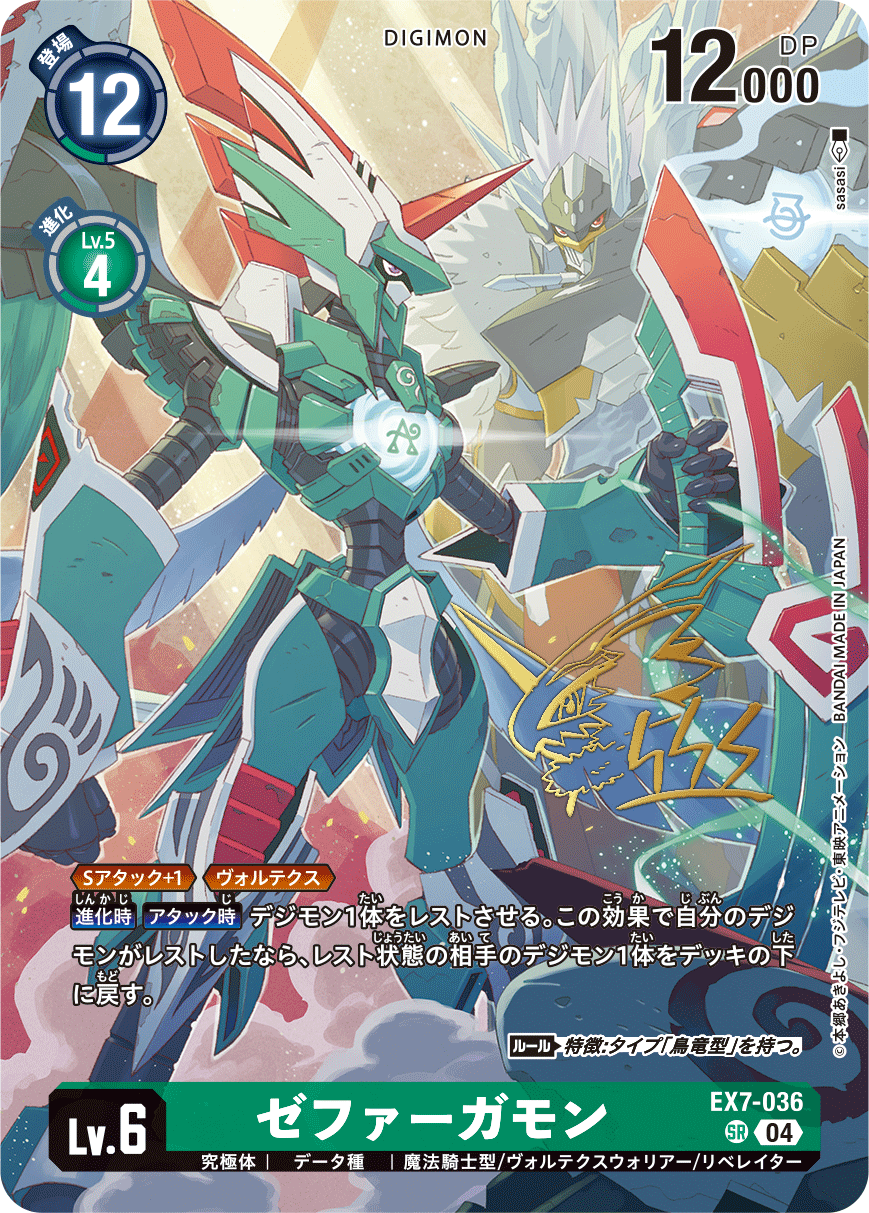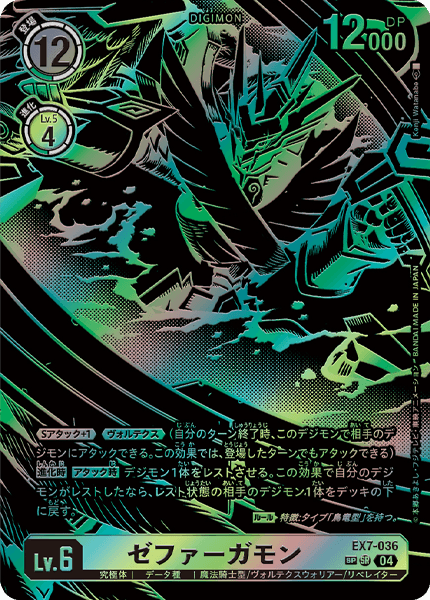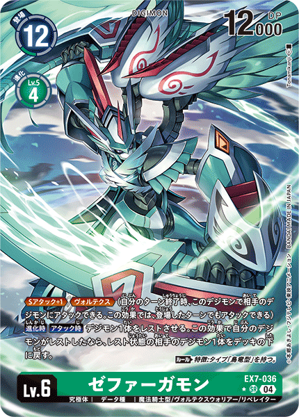 Lv.6 ゼファーガモン EX7-036 SR 究極体 | データ種 | 魔法騎士型/ヴォルテクスウォリアー/リベレイター ≪Sアタック+1≫≪ヴォルテクス≫(自分のターン終了時、このデジモンで相手のデジモンにアタックできる。この効果では、登場したターンでもアタックできる) 【進化時】【アタック時】デジモン1体をレストさせる。この効果で自分のデジモンがレストしたなら、レスト状態の相手のデジモン1体をデッキの下に戻す。 〈ルール〉特徴:タイプ「鳥竜型」を持つ。 ---