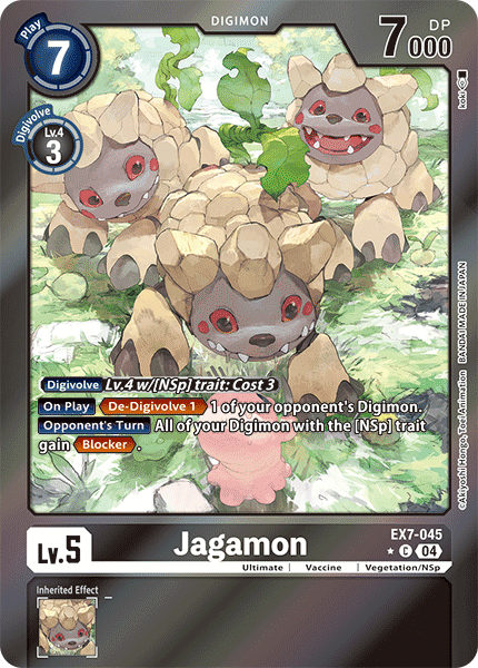 Lv.5 Jagamon EX7-045 C Ultimate | Vaccine | Vegetation/NSp [Digivolve] Lv.4 w/[NSp] trait: Cost 3 [On Play] <De-Digivolve 1> 1 of your opponent's Digimon. [Opponent's Turn] All of your Digimon with the [NSp] trait gain <Blocker>. --- -