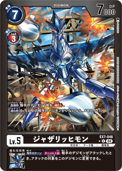 Lv.5 ジャザリッヒモン EX7-046 U 完全体 | データ種 | 機竜型 【登場時】相手のデジモン1体を≪退化1≫。 【進化時】Lv.5以上の相手のデジモンがいないなら、メモリー+1。 --- 【相手のターン】[ターンに1回]相手のデジモンがアタックしたとき、アタックの対象をこのデジモンに変更できる。