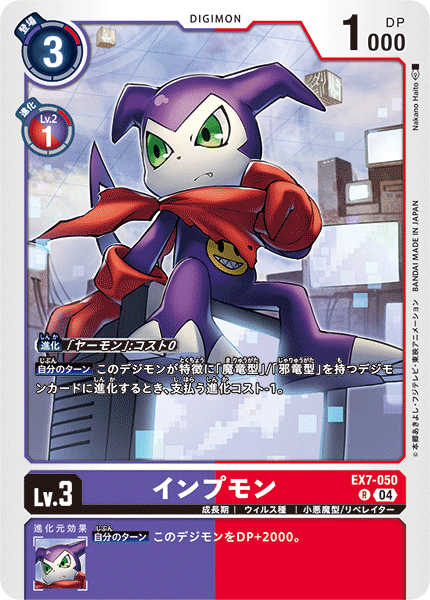 Lv.3 インプモン EX7-050 R 成長期 | ウィルス種 | 小悪魔型/リベレイター 【自分のターン】このデジモンが特徴に「魔竜型」/「邪竜型」を持つデジモンカードに進化するとき、支払う進化コスト-1。 --- 【自分のターン】このデジモンをDP+2000。