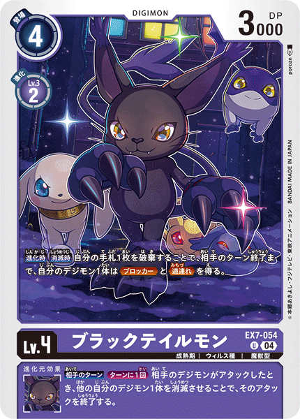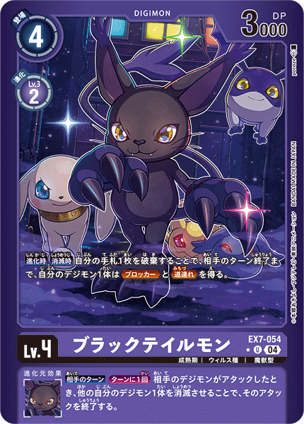 Lv.4 ブラックテイルモン EX7-054 U 成熟期 | ウィルス種 | 魔獣型 【進化時】【消滅時】自分の手札1枚を破棄することで、相手のターン終了まで、自分のデジモン1体は≪ブロッカー≫と≪道連れ≫を得る。 --- 【相手のターン】[ターンに1回]相手のデジモンがアタックしたとき、他の自分のデジモン1体を消滅させることで、そのアタックを終了する。
